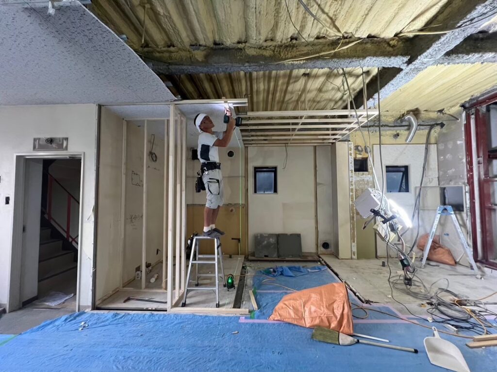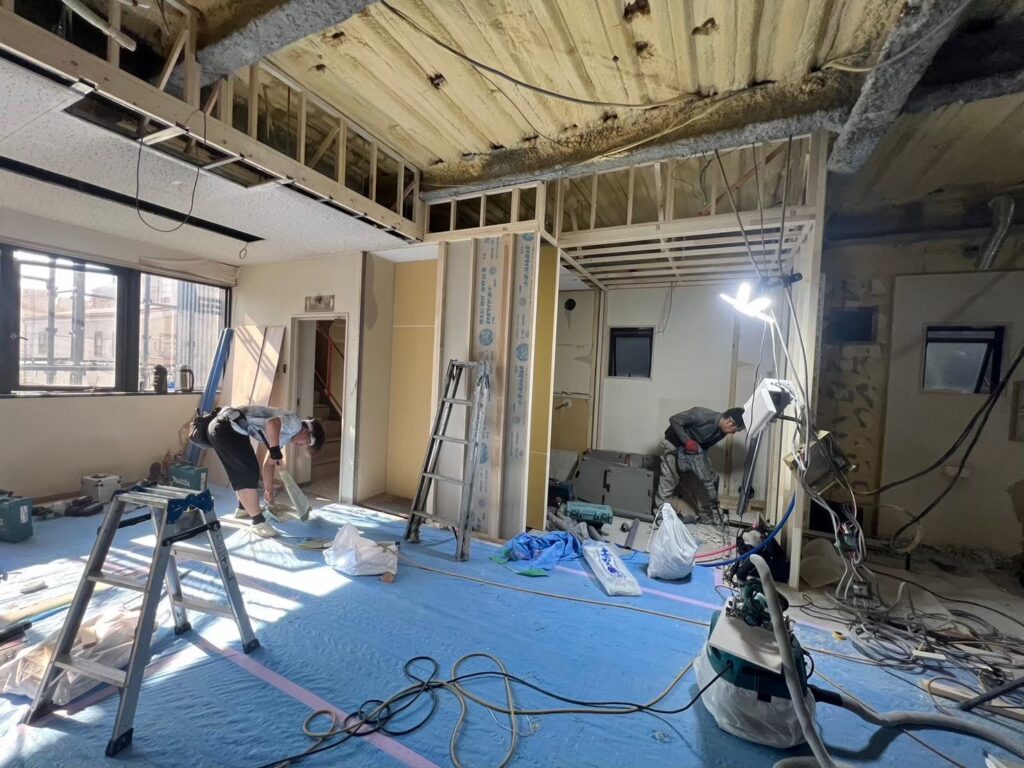 間仕切り壁や天井下地の施工を行い、空間の輪郭が少しずつ見えてくる段階です。